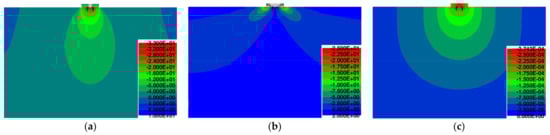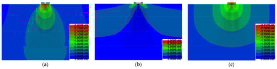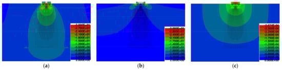Figure 16 displays the stress σy distribution in the anchorage block from reinforced concrete of fiber-reinforced concrete (75 kg/m3 and 110 kg/m3). It can be seen that in the case of force F = 500 kN and 1000 kN, no cracks are expected (Figure 16a,b). On the other hand, for F = 1400 kN, the anchorage zone stays crack-free only in the case of fiber-reinforced concrete with a higher volume of fiber (see Figure 16c).