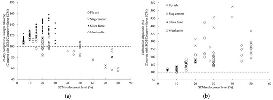 Influence of SCM replacement level on (a) compressive strength (b) carbonation depth of concrete [27].