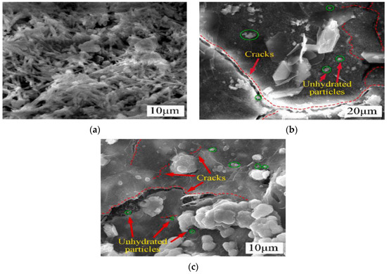 Rakhimova and Rakhimov [176] observed that RCP has a mixed mineral composition of quartz, calcite, ettringite, unhydrated OPC, calcium silicates, and aluminate hydrates. The presence of unhydrated OPC makes RCP a promising SCM [175]. Kim and Choi [177] utilized two types of RCP with different Blaine fineness values (928 and 1360 cm2/g). The microstructural analysis revealed that the shape of RCP particles was angular and identical to that of cement particles; however, RCP particles were larger than cement particles and the surface of the particles contained hydrated products. As observed from Figure 4, the compressive strength decreases with the increase in RCP proportion, irrespective of fineness. With 15% RCP, the strength loss at 28 days compared to the reference was 25–28%, while it was 64–73% for 45% RCP. The significant loss in compressive strength was attributed to RCP consisting of non-reactive powders. Zhu et al. [178] studied the impact of 30% RCP (produced by crushing and grinding brick and concrete waste) on the concrete’s properties. Concrete with RCP developed strength faster than concrete with FA at a younger age, which was attributed to the unhydrated cement particles in RCP. Sun et al. [179] evaluated the effect of RCP on mortar properties with and without spontaneous combustion gangue powder (SCGP). Mortars with 30% and 50% RCP had compressive strengths of 17.87 and 14.57 MPa, respectively, compared to 26.13 MPa for the control mix. Meanwhile samples with 15% and 25% RCP combined with SCGP had compressive strengths of 22.85 and 14.99 MPa, respectively, after 28 days. As shown in Figure 5, RCP-containing mixes contain inert particles, which reduce the total binder activity and hydration products, causing micro-cracks and strength loss. RCP’s lower pozzolanic reactivity and fineness increase the chloride penetration, thus it can be observed that a higher pozzolanic activity material such as SCGP may be utilized along with RCP to achieve better strength.