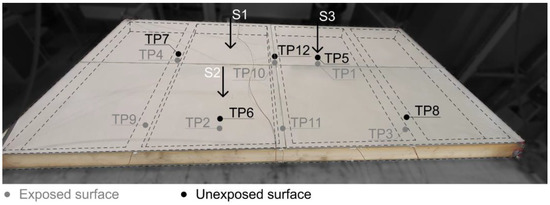 The temperature courses were measured in the composition of the structure between the layers and on the unexposed surface structure. The unexposed surface temperatures were measured using attached thermometers at positions S1, S2, and S3. The measured points can be seen in Figure 3. The final evaluation of the structure was based on the measured temperatures during the test. The temperatures allow the assessment of the limited state (LS) of thermal insulation ability (I). The criteria of this LS (I) were assessed based on the temperature increases. The average temperature increase on the unexposed face is limited to 140 °C above the initial mean temperature, and the maximum temperature increase at any point is limited to 180 °C above the initial mean temperature [32].