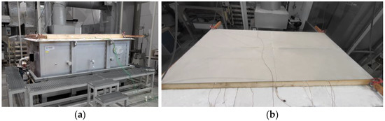 The standard FR tests are performed on specimens with dimensions 3 m × 3 m, according to the test procedure for non-load-bearing walls. The structure was tested with reduced dimensions as a medium-scale FR test. The internal dimensions of the testing equipment (combustion chamber) were 2 m × 1 m × 1 m. The furnace allows temperature loading up to a maximum value of 1100 °C. The required conditions were monitored and met during the experimental test. The specimen was placed on the upper part of the testing equipment in a horizontal position, with an overlap of 150 mm on each side. The sample was exposed to fire from the bottom, so the area exposed to fire was 2 m × 1 m. The testing method is based on the results of previous research [28,29]. The temperature distribution is slightly higher in the middle-scale combustion chambers than in the standard testing equipment [30]. The results from the other previous study [30] showed that the heat exposure to a test specimen in a furnace oriented horizontally was slightly severer (4%) than in a furnace oriented vertically, and the heat exposure in the intermediate-scale furnace was approximately 15% higher than in the full-scale equipment. The effect of the orientation of the tested specimen (vertical vs. horizontal) was also investigated in the previous research [28,29]. The results were consistent with the data and conclusions presented in similar researches [30].