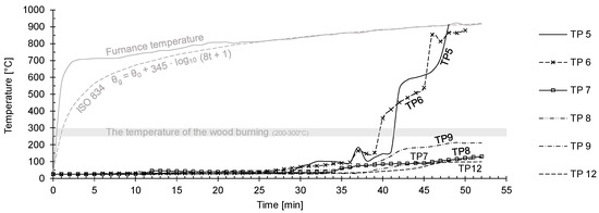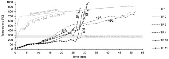 Data from the thermocouples placed at the positions under the timber elements are shown by the temperature profiles TP3, TP4, TP10, and TP11. TP10 and TP11 show higher temperatures at the position of the glued board joints. The chart shows an obvious failure of the cement fibre boards between the 25th–30th minute (rapid rise in temperatures). The evaluation of the structure type can be based on these values.