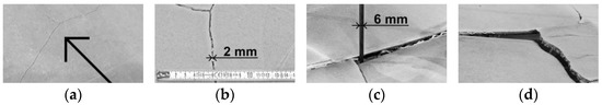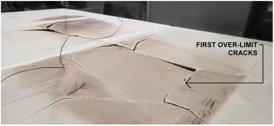 The unexposed boards (upper surface) were broken by cracks. The progress of the defect of the upper cement fibre boards can be seen in Figure 7. The first crack formed at the position between the timber studs around the 42nd minute of the test—Figure 7a. The size of this crack was about 2 mm in the 47th minute after the start—Figure 7b. The other measuring of the crack was according to the gap gauges based on the EN standards. The 6 mm diameter gap gauge can penetrate a through gap, such that the end of the gauge projects into the furnace—Figure 7c. The gauge cannot be moved in the gap for a distance of at least 150 mm, so this requirement for the LS (E) violation was not exceeded. This LS (E) was exceeded in the 52nd minute because of the penetration of a 25 mm gauge through the specimen—Figure 7d. This over-limit crack formed at the position of the thermocouple with TP5.