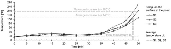 The temperature courses from the data in Table 2 are shown in Figure 8. The highest values were measured at the position of surface point S1 (see Figure 3). The limit value (average increase of Δt = 140 °C) was exceeded after the 47th minute. The limit value of the maximum increase of Δt = 180 °C was exceeded in point S1 also around the 48th minute. Exceeding the limit values can be seen in the figure below.
