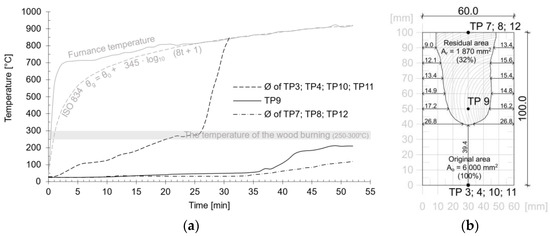 (a) Average temperature profiles (TPs) of the studs; (b) Cross-sectional area of the timber element after the test.