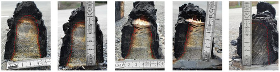 The load-bearing capacity of structures must be tested under the loading on the samples. The loading must comply with the standard requirements throughout the test. The experimental test equipment does not allow the loading during the test due to the properties of the equipment. The load-bearing capacity requirements were, therefore, not monitored. The condition of the timber elements was analysed after the end of the test. The studs were cut in the most damaged positions, and all samples were measured and registered. The data were then processed in the CAD software for further analysis. The timber studs were exposed to fire from one side in the first half of the experiment. This is given by the encapsulation in the non-combustible cement fibre boards. Charring of the timber occurred only on the edges in contact with the fire-exposed boards, so there was a less rapid reduction in the wooden mass and strength [33,34]. After the exposed boards were completely damaged, the insulation between the timber studs loosened and fell off. The timber elements were exposed from three sides from this time, and the reduction in the stud’s dimensions was faster. The cross-sectional area after the 52 min test can be seen in Figure 9b and Figure 10.
