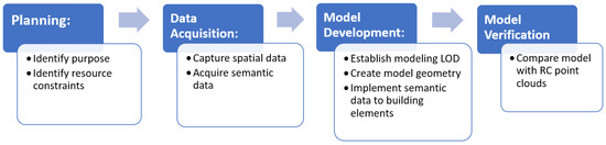 A typical HBIM workflow includes a preliminary phase to identify the purpose and resource constraints of the project, a data collection phase to acquire spatial and semantic data, a model development phase, and a verification phase (Figure 1). The resulting HBIM repository stores geometrically precise representations of built heritage via parametric objects with embedded metadata. Parametric objects are instance-based objects that incorporate information (metadata) relevant to the component [32]. The published literature reveals several challenges that limit the full potential of HBIM, including the lack of parametric object libraries for historic building elements [16,33,34,35], issues of surveying complex and heterogeneous geometries of historic architecture [14,15,20,35], and an absence of historic construction data [20,25,31,35,36,37].