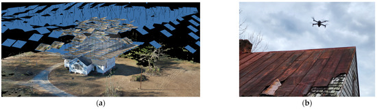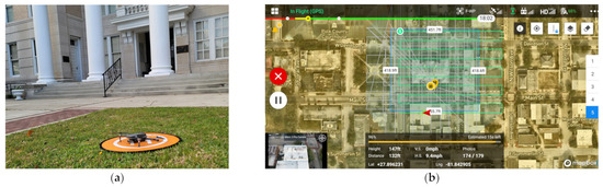 UAV photogrammetry: (a) UAV photogrammetry schematic; (b) a Mavic Pro 2 UAV [41] is being used to survey a historic structure.