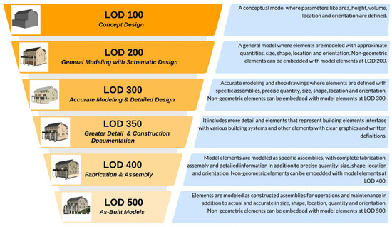 - Victor, L. BIM Level of Development (LOD) 100, 200, 300, 350, 400, 500. Available online: https://www.united-bim.com/bim-level-of-development-lod-100-200-300-350-400-500/ (accessed on 26 December 2022).