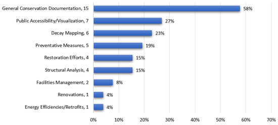 To obtain more up-to-date understanding of the implementation of HBIM, the researchers conducted a preliminary review of 26 HBIM case studies published between 2018 and 2022. The aim of the review is to identify primary HBIM applications and whether curators participated in the decision-making process. A literature search of Web of Science (WOS) was conducted, using the following specific keywords: case study, conservation, cultural, HBIM, heritage, historic, and restoration. Data from each case study was extracted to analyze the objectives of study, methods, results of the HBIM process, and if stakeholders were explicitly involved. Figure 6 shows the stated primary aims for each of the 26 HBIM case studies as a percentage of the whole.