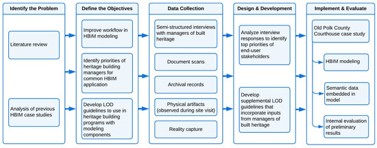 The research methodology is divided into five stages as adopted from the design science research methodology proposed by Peffers, Tuunanen, and Chatterjee [62], summarized in Figure 8. The “problem”, or gap in knowledge, will be identified via a literature review and analysis of published HBIM case studies. Identification of this gap will assist in defining the objectives of the research. Data collection will include semi-structured interviews, study of original design and construction documents, review of archival records, observation of physical artifacts, and incorporation of reality capture program of the case study. Development of the proposed solution incorporates an analysis of interview responses to identify the top priorities of built heritage stakeholders in the context of common HBIM applications. The analysis will be used to develop a LOD supplement suitable for HBIM. Finally, the proposed LOD supplement will be validated in a case study and demonstrated in the creation of specific building elements. An internal evaluation of the results will provide insights into areas of improvement for future research.