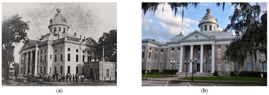 The Old Polk County Courthouse (OPCC): (a) workmen stood next to the newly completed courthouse in 1909 [69]; (b) present-day view of the building.