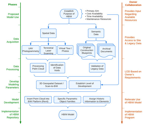 The most extensive method for HBIM development is manual, requiring labor-intensive work to reconstruct non-standard historic structural and architectural components [20]. One method to control the resources required to complete a HBIM program is identifying the appropriate Level of Development in the early stage of an HBIM program.