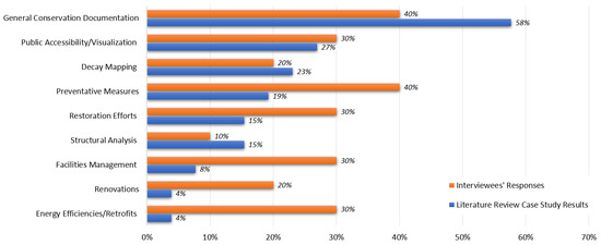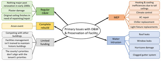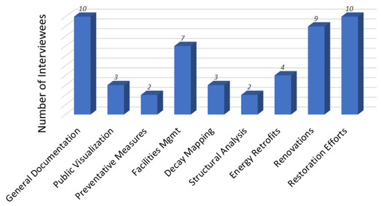 This question was posed to determine the current primary issues with each of the historic facilities, which could then lead to investigating the potential use of HBIM in correcting the most important problems. As seen in Figure 11, the three primary problems raised by stakeholders are Mechanical Electrical Plumbing (MEP) systems, water intrusion, and issues caused by limited funding.