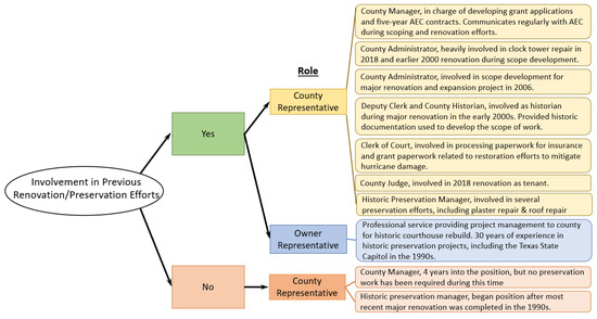 This question was used to identify the extent of interviewees’ involvement in previous renovation efforts and whether they have felt included in decision-making. As shown in Figure 13, 80% of interviewees have experience in previous renovation/preservation efforts related to the historic courthouse under their responsibility. Seven of the eight individuals who responded in the affirmative are county employees. One is an experienced project manager acting as the county’s representative for the rebuild of their facility after an arson event reduced the building to its exterior load-bearing masonry walls. Two respondents who do not have prior experience stated this is due to the short tenure in their current position. All interviewees involved in previous renovation/preservation efforts stated they felt included in the decision-making process. However, in a follow-up question about their particular role in the process, it was determined that the majority of their involvement related to contracting, review of proposals, and selecting contractors. As HBIM becomes more common, it is critical to include building managers centrally into the HBIM process through the use of LOD guidelines and other practices.