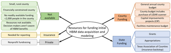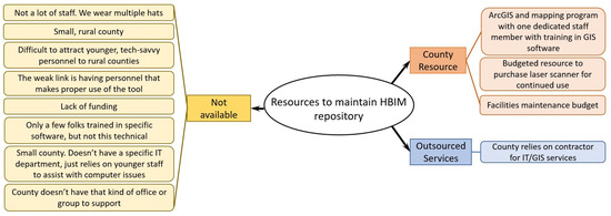 Each of the ten interviews was held via Zoom or phone teleconference and then digitally transcribed. Interview transcripts were proofread and revised for added accuracy. Qualitative color coding (QCC) was performed for each interview transcript to derive themes and patterns from the analysis. QCC is an important tool for turning the raw qualitative research data into a more communicative and reliable format for the audience [70]. This process involved generating a series of codes created through non-numerical key words or phrases, including the following broad codes: staffing, training/software, knowledge limitations, funding, data maintenance, role/responsibility, population, perceived benefits of HBIM, and facility priorities. A thematic analysis further examines the responses to determine their similarities and differences. The results of each question are presented, analyzed, and discussed below.