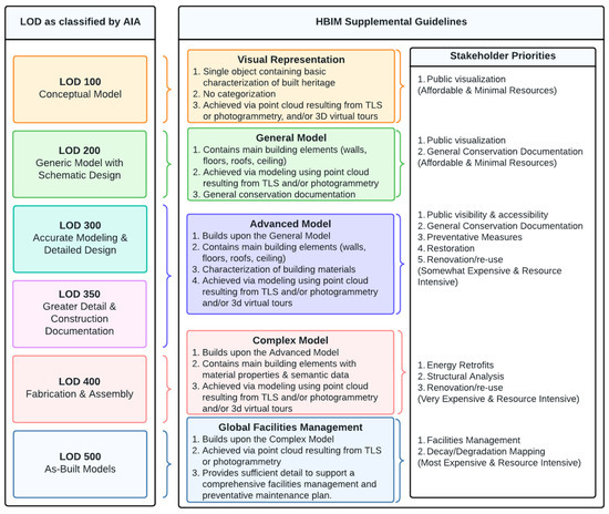 Past studies propose an adaptation of the standard LOD definitions to HBIM, such as Castellano-Roman and Pinto-Perto’s [59] five “Levels of Knowledge” (LOK) for HBIM. Heritage Scotland proposes three LODs applicable to HBIM, which range from standard CAD outputs (Level 0), data transferred to a 3D CAD environment (Level 1), and reality capture data used for parametric 3D modeling and collaboration (Level 2) [1].