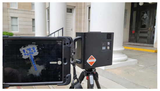 UNAVCO [42] describes the light detection and ranging technology, or LiDAR, as a remote sensing technique that determines the precise distance to an object by timing a laser beam reflected back from that object (Figure 3a). Terrestrial laser scanning (TLS) is a process to capture dense point clouds of objects using a ground-based LiDAR device (Figure 3b) [43]. To document a structure it will typically require multiple scans to be taken to provide complete coverage [44]. The captured scans are then processed in a specialty program through the steps of colorization and registration to create a single high-density 3D point cloud of the documented structure [45]. TLS is contact-free and can be used to develop, update, and compare BIM models [46]. TLS also has immediate applicability in HBIM development [10,47,48,49,50] (Figure 3c), providing researchers and facility managers the capacity to capture the existing condition of heritage structures and identify degradation over time with multi-temporal scans [37].