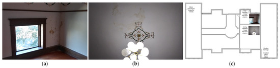 Demonstration of decay mapping using the HBIM “Complex Model”: (a) water damage to the courtoom balcony; (b) water damage to the courtoom plaster ceiling; (c) identification of damage using tags in Revit.