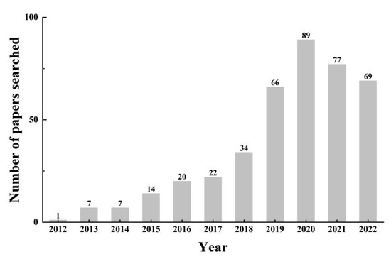 Currently, BECP methods are mainly divided into three types: white box, black box, and gray box [21,22]. The white box, also called a physical model, is built and analyzed based on thermodynamic principles and detailed building energy characteristic information. Commonly used building energy consumption simulation software programs include EnergyPlus, DesignBuilder, DeST, eQuest, TRNSYS, and DOE-2. These software programs can establish energy consumption prediction models according to the specific structural parameters of the buildings, outdoor meteorological data, and air-conditioning system performance. However, the disadvantage of a physical model is its requirement of multiple complex verification and adjustments to ensure satisfactory reliability of the predicted results. Therefore, scholars have developed a black-box model, also known as the data-driven method, which does not rely on thermodynamic principles and building energy characteristics. The data-driven method uses specific algorithms to analyze the collected large datasets and mine the logic between the data to achieve automatic decision-making. Compared with the physical model, data-driven methods are only based on large datasets and machine learning (ML) algorithms [23,24], which require a large data sample size. The gray-box model is a combination of a physical model and data-driven method to predict building energy consumption. Although the model offers improved prediction accuracy and reduced calculation difficulty compared with the physical model, the process of establishing the model may incorporate inaccurate assumptions [22]. In general, black boxes provide greater practical convenience than white or gray boxes. The use of data analysis and mining of large datasets circumvents the necessity of building a physical model to forecast energy consumption. As presented in Figure 1 (data source: Web of science), research on data-driven BECP has grown significantly since 2019. Owing to the development of building intelligence and wide application of high-precision data collectors, abundant historical data are available for studying energy consumption prediction. By searching “data driven” and “building energy consumption prediction”, we found greater than 400 related research papers in this review. Considering the correlation of journal impact factors, paper citations, and BECP, 116 research results strongly related to BECP, with journal impact factors of greater than 6.0 or having higher than five citations, were selected for this literature review.