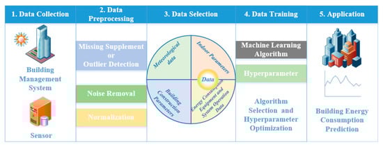 As depicted in Figure 2, the data-driven BECP process comprises five main parts: data acquisition, data preprocessing, data selection, data training, and application. Data are generally collected from building (energy) management systems and sensor records. Data preprocessing involves integrating the data for missing values, outliers, noisy data, or numerical discrepancies in the original data. Data selection involves extracting the building energy consumption phase characteristics as the main input data for prediction. Data training seeks the predicted and actual values of energy consumption to achieve a high prediction performance of the model. The application part forecasts the corresponding building energy consumption as required. Therefore, the core of data-driven BECP comprises the data and algorithms. This section reviews the current research status of data-driven BECP from the perspectives of both data and ML algorithms.