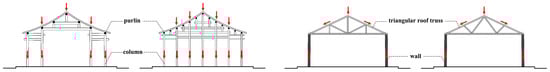 At the end of the 19th century, with the emergence of European-style architecture, the new structures, materials, construction techniques, and equipment of western architecture, such as steel, cement, and glass, were introduced to China [3]. In terms of architectural structure, the introduction of the brick wall load-bearing system and steel–wood composite roof truss promoted the transformation of the traditional Chinese wood structure system, meeting the needs of modern society. The transformation mainly focused on the roof’s stress method and structural form, which were different from traditional post-and-lintel construction and column-and-tie construction. This was reflected in using the Western spar roof, which was distinct from the Chinese purlin roof, and walls also became a part of the load-bearing system [4] (Figure 1). In addition, new technologies could not be fully applied in the construction of these buildings under the restrictions of China’s social economy, engineering level, and lagging social consciousness at that time, but they were important components in the process of China’s architectural modernization and represented the cultural exchanges between China and the west [5]. These buildings, formed under complex social transformation and cultural integration, urgently need to be restored and reused after more than a century.
