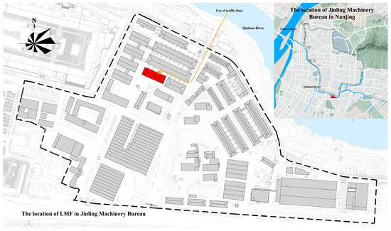 The Jinling Machinery Bureau was built during the self-strengthening movement and was a specific product of the idea of Chinese essence and Western utility. The fusion of Chinese and western cultures was inevitable during planning and construction. In 1865, Li Hongzhang, then governor of Jiangsu and Jiangxi, considered the spatial needs of modern military–industrial production based on four standards [31]: (1) convenient water and land transportation to meet equipment and coal supply requirements; (2) a position close to residential areas to facilitate worker commutes; (3) the inconveniences of building in an urban area in order to prevent experiments and threats to security; and (4) the need for additional sites for later expansion. The final site was chosen outside the Zhonghua Gate in Nanjing, along the Qinhuai River (Figure 4) [33]. In 1886, Li reported to the Guangxu Emperor on the expansion project of the Jinling Machinery Bureau, writing that “the additional factory buildings were built with foreign solid wood, and all the construction technologies followed foreign modes” [34]. European engineers designed these buildings, and the construction and mechanical installation were completed by Chinese workers [30]. British engineer G. Bracegirdle designed and supervised the construction of the LMF, which was completed in 1887 [35,36]. Located on the west side of the Jinling Machinery Bureau, the LMF was the second plant built in the area and the largest one at the time (Figure 5).