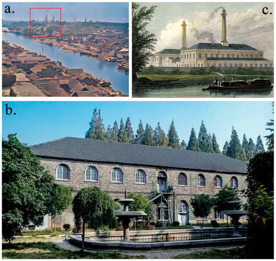 The Jinling Machinery Bureau in the early 20th century (a); the appearance of the LMF before restoration (b); the Imperial Gas Light Co. on Regent’s Canal in London in the early 19th century (c). (a,c) from [40]; picture in (b) taken by Y.W.