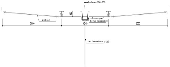 The LMF is a combined load-bearing system with wooden beam frames and brick walls. The load-bearing wall is an 800 mm thick continuous exterior wall made of gray bricks and lime mortar. A combined system of wooden beams and cast iron pull rods is applied on the first and second floors to solve the load-bearing problem of large-span wooden components (Figure 8). This structure is a typical string-beam structure, which did not appear in European industrial buildings until the mid-19th century. It is also the earliest and only case found in China [36]. This structure consists of a wooden beam and three pull rods, with the outer pull rod and wooden beam end connected by a metal anchor, the middle and outside pull rods hinged by a metal ring, and the middle pull rod and wooden beam connected through metal members to fix the force point. The string beam was an innovation of foreign engineers based on the construction conditions in China at that time. For the first-floor structure, the load-bearing method of combining string beams and cast iron columns was adopted. The wooden beams are made of American fir with 450 mm × 450 mm sections. Cast iron columns with a diameter of 140 mm were adopted for independent load bearing in the midspan. The stigma in the flower basket style allows the pull rod to pass through to ensure the transmission of lateral tension (Figure 9). For roof structure, a string beam combined with a triangle timber truss was adopted. Only two wooden columns are set at the node of the three-side slope roof at both ends of the building. Unlike the typical roof truss of the time, the roof truss of the LMF was designed with cast iron pull rods to reduce the midspan deflection of the lower chord timber beam through tension. In this way, the overall span of the roof truss was increased, and the number of diagonal tension members between the top and bottom chords was reduced (Figure 10). This unique structural design provided spacious and column-free space for industrial production on the second floor. This innovative harnessing of the properties of steel and wood hybrid structures was a milestone in the history of modern industrial construction technology in China.