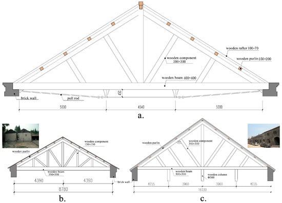 - Wood moisture content: The main wood members were sampled for on-site tests, and the moisture content was 7% according to an electronic moisture meter (model XSD-18, Shanghai Longtop Instrument Co., Shanghai, China).