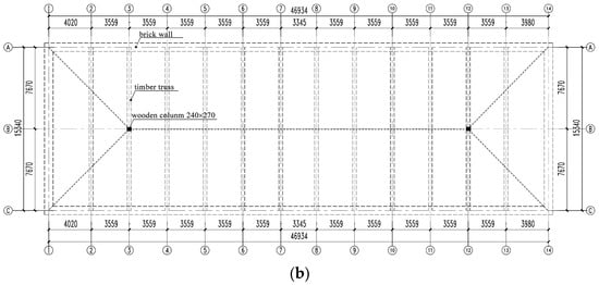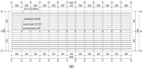 Table 2. (a) Structural check: calculation of load-bearing wall (seismic check). (b) Structural check: calculated value of load-bearing wall (compression bearing capacity check). - The standard values of the compressive and tensile strength of cast iron are 405 MPa and 325 MPa, respectively. Wood strength value was taken according to the Code for Design of Timber Structures [52]; the reduction coefficient value suggested in the Technical Standard for Maintenance and Strengthening of Historical Timber Building [53] was also considered. According to the ANSYS analysis [54], the load-bearing capacity of the combined beam and roof truss basically met the requirements of the current national standards [55].