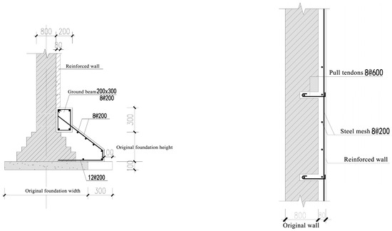 The assessment results showed that the original foundation has a good load-bearing capacity without structural damage. However, corresponding preventive protection work was carried out to ensure the safety of the later use of the LMF. A new reinforced concrete strip foundation was added inside the original one to improve its overall performance, which was concealed in the ground to eliminate visual interference with the original structure and supported the load of the newly added polymer mortar reinforcement walls inside (Figure 14). According to the regulations [55], the overall bearing capacity of the reinforced foundation was raised by one grade to level Au.