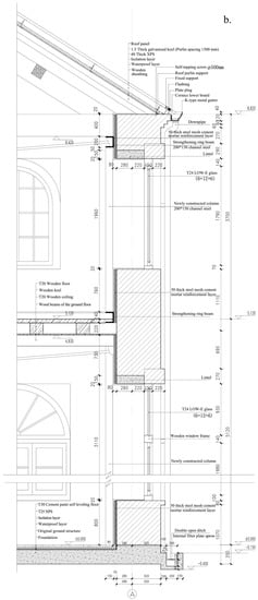 Structural reinforcement includes strengthening the load-bearing brick wall, composite beam of the first floor, and he composite roof truss of the second floor. The stress mode of the original structure should be kept, and the intervention should be minimized to avoid additional damage [56]. The load-bearing walls were reinforced overall, and 50 mm thick steel mesh polymer mortar layer was added inside (Figure 14). A reinforced layer can improve the vulnerability, carrying capacity, and deformation resistance of an original brick wall [57]. The grouting method was used to deal with the cracks in the external walls, and new mortar with strong adhesion and compatibility was injected [58].