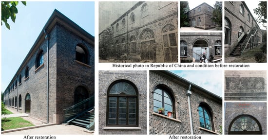 As the restoration of historical appearance includes the preservation, repair, and renewal of the building to express its historical value, the objective identification of the historical elements on the building façade is a key step [59]. The historical elements of the façade from the first construction, such as architectural silhouettes and decorative details, should be preserved. Some damaged but necessary functional elements, such as windows, doors, drainage systems, and roof tiles, are repaired or renewed. During the restoration of the LMF, its style elements were identified from the historical materials, and efforts were made to pursue the organic combination of new technologies and the original building. Bricks with over 1/4 broken cross-sections were replaced with new, customized ones according to the original size and material. Partially weathered wall bricks, with load-bearing capacity, were kept to maintain the historical sense. The doors and windows were repaired as they were. The messy security grilles were removed, and the glass and door panels were replaced with materials with better heat insulation properties. Specifically, the door panels and window frames were repaired with anticorrosive logs, and the windows were restored with double-layer low-e glass. Because the original gray terracotta roof tiles had extensively failed, custom-made replacements were accordingly prepared and installed to ensure a similar visual effect. In the meantime, insulation and waterproofing were added. The remaining gutter and downspouts were removed, and replacements of the original size were installed at the original location. All façade element renewals were performed to be as close as possible to their original state while eliminating safety hazards (Figure 16).