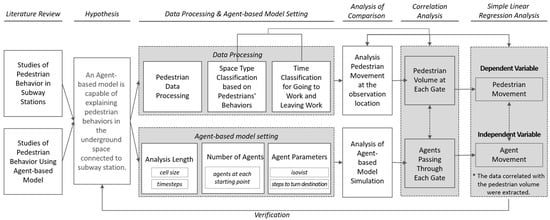 This study explores how well an agent-based model can explain observed pedestrian behavior in the underground space connected to subway stations. The hypothesis in this study is as follows: “An agent-based model is capable of explaining pedestrian behavior in the underground space connected to subway stations”. To verify this statement, the study proceeds in five steps.