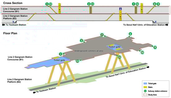 In Gangnam Station (Line 2), the platform is located in the second basement (B2) level, and the ticket gates and the station entrances are located in the level (Figure 2). Pedestrian behaviors on the platform depend on the transfer locations in the previous stations rather than the spatial configuration of this station itself [8]. Therefore, this study excluded the B2 level and focused on the B1 level, where pedestrian behaviors are related to the spatial configuration of the station space. In the B1 level, a corridor links the underground commercial area to the Sinbundang Line for people who wish to transfer. Gangnam Station (Line 2) has 8 entrances. Since the road intersection above this station does not have crosswalks, people sometimes use the B1 level to cross the intersection. More than 89 city and inter-city bus routes connect Gangnam Station to Seoul’s other centers and to satellite cities around Seoul [37].