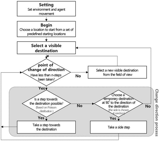 Figure 3 shows the agent’s path selection process in the model [12,38]. First, the scope of analysis space, environment, and agent parameters is set. Then, the number of agents at the starting point is entered. Each agent establishes a destination at the starting point and takes steps before changing direction. Upon arrival, the agent determines a temporary new destination using the isovist. It is based on Poisson distribution. If the agent’s field of view is unclear, they take a step to the left or right to set a new destination. When an agent arrives at a new destination, the agent moves iteratively according to the same rules.