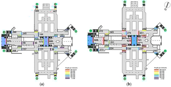Pedestrian volume count in first basement level (B1), Gangnam Station: (a) morning commute hours (8–9 a.m.); (b) evening commute hours (6–7 p.m.). (Maps created by the author from Kim et al. [8]).