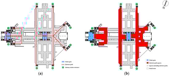 Among the pedestrians inside Gangnam Station, workers comprise the largest group [37]. This indicates that during commute hours, most pedestrians have a definite destination and are well aware of its location and the shortest paths to reach it. They tend to travel along the shortest path to their destination, from the subway platform to the ticket gates to the station exits [8,39]. Since pedestrian behaviors differ depending on whether they take the shortest path or not, this study examined pedestrian behaviors separately for different sections of travel. To this end, “shortest path space” was defined as in Figure 5, by directly connecting station exits to the nearest ticket gates (Figure 5a). Spaces outside the “shortest path space” were categorized simply as the corridors of the underground commercial areas.