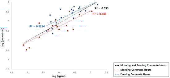 In sum, the regression is statistically significant and can explain the observed pedestrian volume for only the shortest path spaces. The two regression equations are presented below (two of an equation), as shown in Equation (2) and Figure 7. The agent simulation has the best explanatory power when the morning and evening commute data are both included (68.4%). Specifically, the pedestrian volume for the morning commute is slightly better explained. This study’s hypothesis that “An agent-based model is capable of explaining pedestrian behavior in the underground space connected to subway stations” is therefore rejected for the entire study area. However, it is not rejected when applied only to the shortest path spaces.