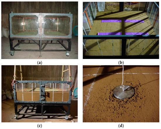 Based on the experimental design in Chen’s work [25], the experimental soil sample was sandy soil, and the main properties of the soil are presented in Table 1. The gradation curves of the tested sands are presented in Figure 1, and the type of sand was classified as medium sand based on the Standard for Geotechnical Testing method (GB/T 50123-2019). To ensure the uniformity of the soil sample density during sample preparation, 3 cm-thick soil layers were loaded in a 2 m × 2 m reservoir (Figure 2a) and were separated by flexible colored paper, as shown in Figure 2b,c. The paper used in the test was very narrow and soft. During the experiment, a small amount of water was sprayed on the paper, making it easier to damage when it received an external force, and thus, the influence on the experiment was very small. After the layout of the model was completed, the surface settlement was measured during DC. The tamper had a weight of 5 kg and a radius of 10 cm (Figure 2d). The tests were conducted in four groups with falling heights of 10 cm, 20 cm, 40 cm, and 60 cm, which were referred to as T1, T2, T3, and T4, respectively. After each test, each section was excavated, and the settlement characteristics were drawn according to the shape of each layer of flexible colored paper (Figure 2e,f). The position of each layer was measured by using a millimeter ruler and image recognition technology [26,27], and the error was within 1 mm.