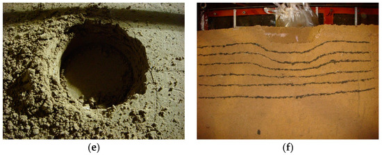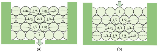 Through the analysis of the experimental results, the displacement of each layer caused by the DC conformed to the characteristics of a Gaussian distribution. This phenomenon is similar to the basic assumption of stochastic media theory, which is often used to calculate the subsidence induced by excavation, such as mining and tunneling. As shown in Figure 7a, the excavation induced the movement of the upper medium, which spread gradually as the distance increased. If the probability of movement is 1 for the particle on the excavation, then the movement probability of the two particles immediately above is 1/2 for each. By analogy, the farther the distance, the smaller the probability and the wider the scope. The movement of soil induced by DC can also be expressed using this perspective. The movement of the particles in the crater will push the soil under the crater downward, as shown in Figure 7b, which is similar to Figure 7a. The definition of stochastic media in the theory refers to granular soils, such as sands and soil–rock mixtures. The material in this test was sand, and thus, the displacement induced by DC was analyzed using this theory.