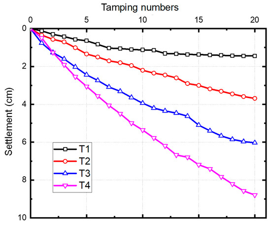 Figure 3 shows the relationship curves between the tamping settlement and the tamping numbers (i.e., the numbers of tamping blows) for four different tamping energies. Figure 3 shows that the tamping settlement gradually increased with increasing tamping numbers. However, the single tamping settlement gradually decreased with increasing tamping numbers. The settlements of the soil surface during the last four tamping blows were basically unchanged, indicating that the soil had reached a relative equilibrium state given the energy level. As the energy level increased, the tamping amount increased and the number of blows for the tamping convergence amount changed. For example, the tamping amount of the T1 energy level was basically unchanged at the beginning of the 7th blow, while the T4 energy level still has a large settlement value at the 22nd blow. Therefore, the depth of the crater was a manifestation of the energy level, which obviously reflected the different effects of the energy level changes.