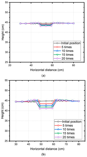 Figure 4 shows the change in the crater given different numbers of tamping blows. For the same energy level, as the tamping numbers increased, the depth of the crater increased continuously, and the slope of the crater became steeper with increasing tamping numbers. For different energy levels, when the number of tamping blows was the same, the shape of the crater differed with respect to the slope and the depth of the crater. From the geometry of the crater, the deformation mainly developed downward, and the depth increased with increasing tamping numbers, as shown in Figure 3. The ground heave was not obvious compared with the whole crater. It indicated that most of the soil in the crater was pushed downward. Therefore, from this point of view, different tamping energy levels resulted in different crater shapes and different numbers of tamping blows led to different crater parameters.