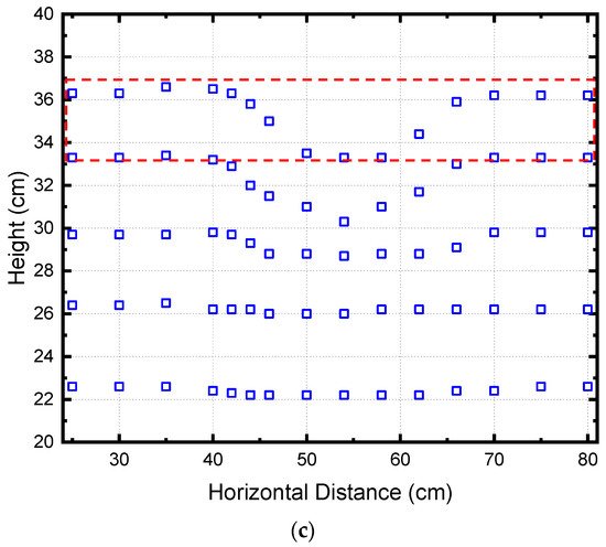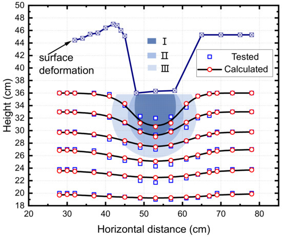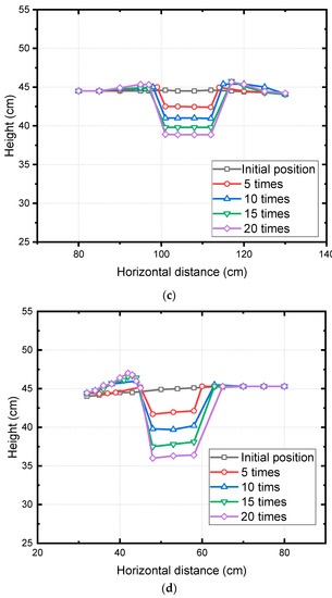 Due to the DC treatment, the soil particles were forced to move downward by the impact of the tamper. As shown in Figure 4, the most obvious displacement of each layer occurred along the central axis of the crater. The displacement decreased with the increase in depth and distance from the central axis. The displacements caused by different energy levels were also different. Take the displacement of the 36 cm layer, i.e., the red box in Figure 5a–c, as an example: the maximum displacements of three energy levels were about 0.8, 2, and 3.2 cm, respectively. Therefore, the displacement induced by DC could also reflect the energy levels in terms of the geometry of the crater.