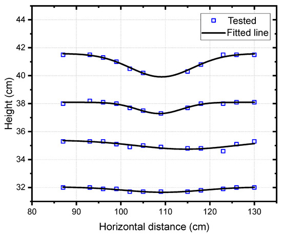 The fitting results in Figure 6 were commendably consistent with the experimental data. The fitting results of the three energy levels are presented in Table 2, which shows a, b, and the fitting coefficient of each layer. The fitting coefficients varied from 0.78 to 0.992, which indicated that the displacement of each layer caused by the DC conformed to the Gaussian distribution.