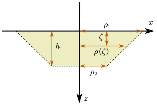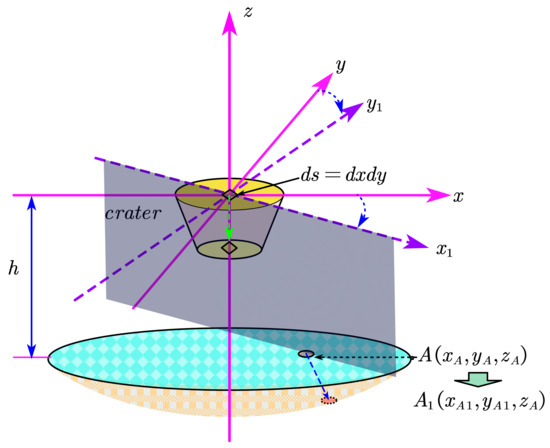 The solution of Equation (18) can be calculated in a rectangular coordinate system. The coordinate system of the crater is converted from a rectangular coordinate system to a cylindrical coordinate system, and the unit representation in the crater is changed from to . As shown in Figure 10, the geometric parameters of the crater are the crater depth h and the dummy variable of depth value ζ in the range of (0, h). The cross-section of the crater is a trapezoid, and the radii at different depths can be expressed as :