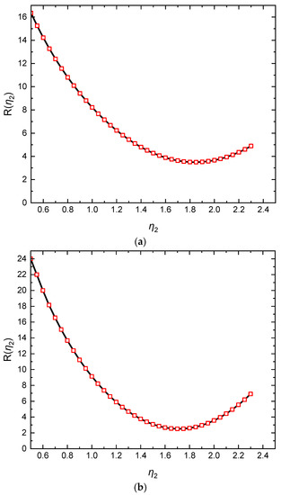 where Wi and are the calculated and observed displacements, respectively. A smaller R(η2) indicates that the parameter η2 is closer to the target value.