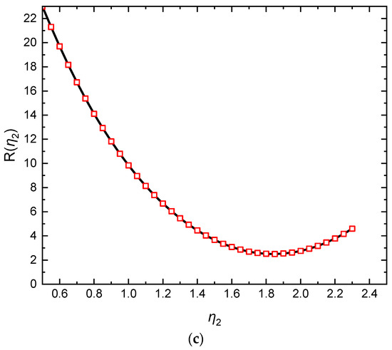 Relationship between η2 and the minimum variance R(η2) for the (a) T1, (b) T2, and (c) T3 energy levels.