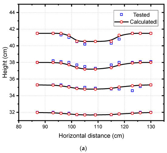 To verify the validity of the calculation results, a T4 model test level was used based on the test results. In the verification process, for convenience, the average value of η2 was taken to be 1.8. Figure 13 was obtained by introducing two parameters into the calculation of Equation (22). The results showed that the calculated data were very close to the test data, demonstrating the feasibility of the method.